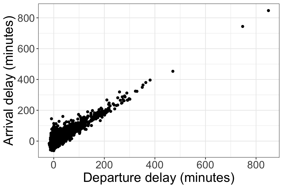 Flights departing late will probably arrive late. We can look at the relationship between departure delay and arrival delay with a scatterplot: