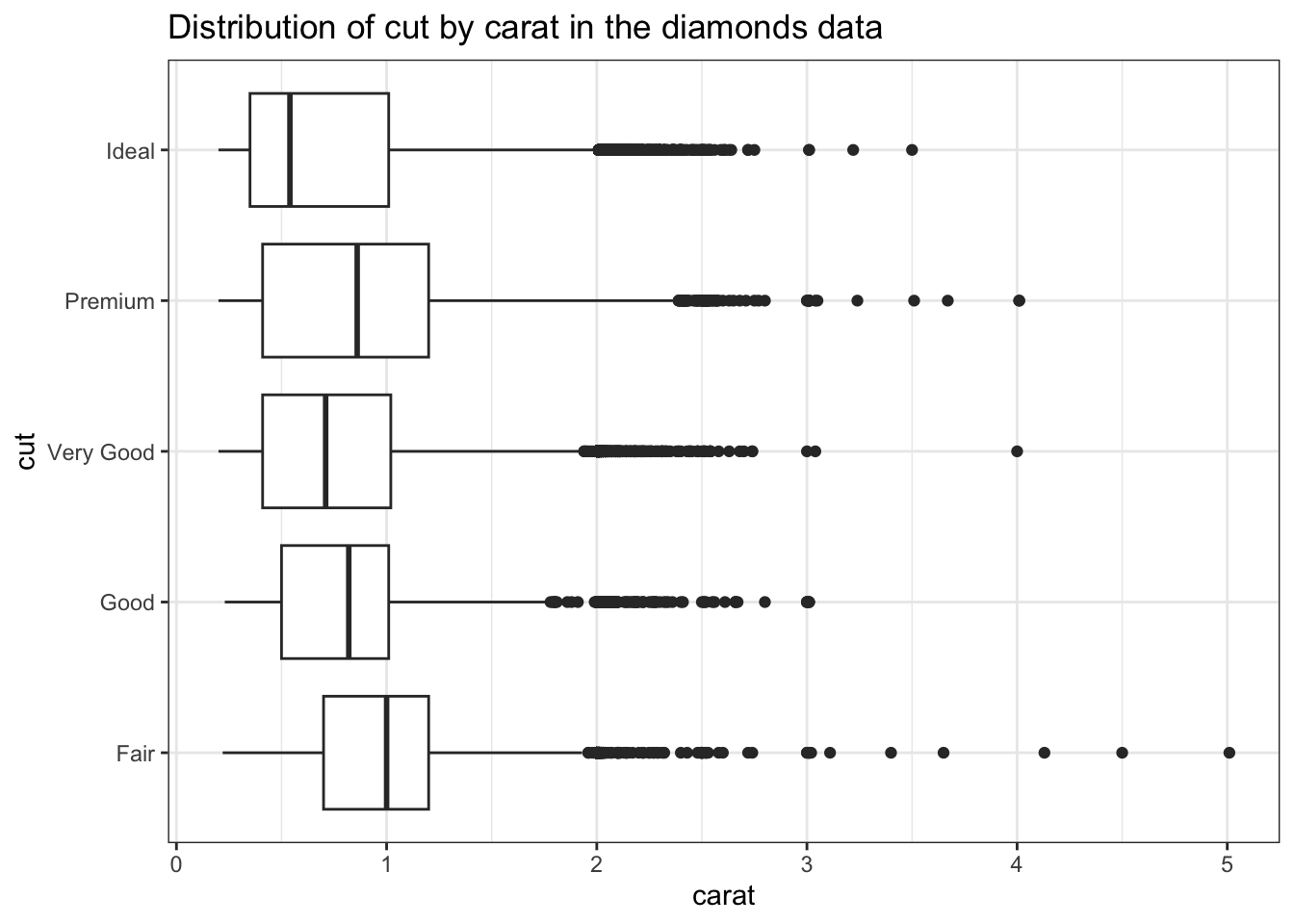 The code below creates side-by-side boxplots to show the distribution of carat for each different cut in the diamonds data: