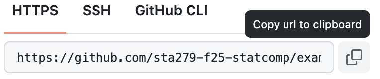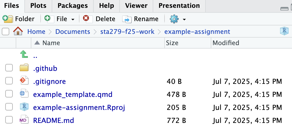 Create a folder on your local computer to store your work in this class. I would recommend calling it something like sta279-f25-work, and saving it somewhere permanent and accessible (NOT your Downloads folder, e.g.). For example, on my computer I created the folder ~/Documents/sta279-f25-work (storing it under Documents). When you later accept assignments through GitHub Classroom, you should store them in this folder, with a subdirectory for each assignment.