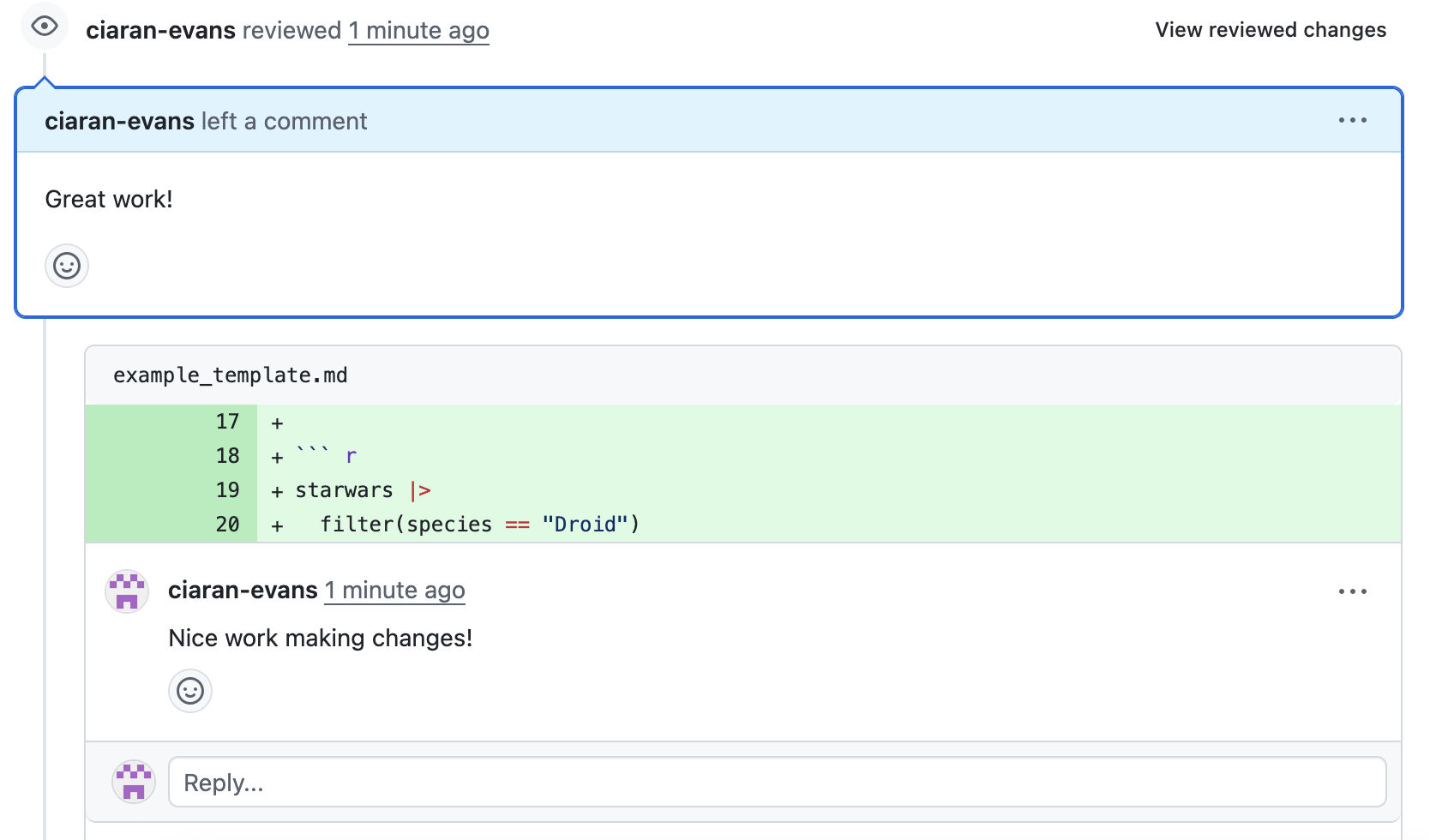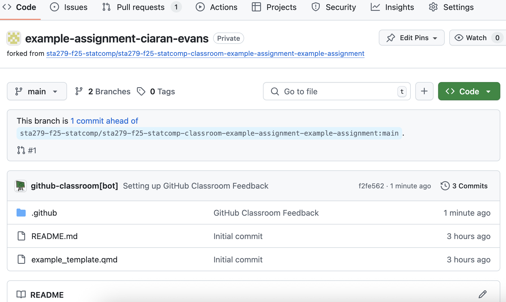 Once you have accepted the assignment, you will be taken to the assignment repository on GitHub (e.g., example-assignment-ciaran-evans). In the example assignment, there are two files already in the repository: README.md provides some information about the assignment (short because full assignment instructions are on the course website), and example_template.qmd provides a Quarto file with starter code.