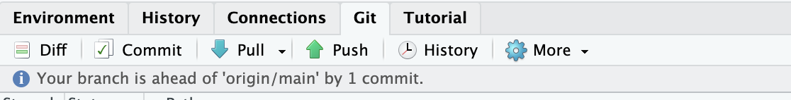 Now you have committed changes to your local Git repository, which means that there is a difference between the version of the code on your local machine, and the version on the remote repository. Indeed, in the Git tab on RStudio, you can see that there is a message saying that your local branch is ahead of the remote branch (origin/main) by 1 commit: