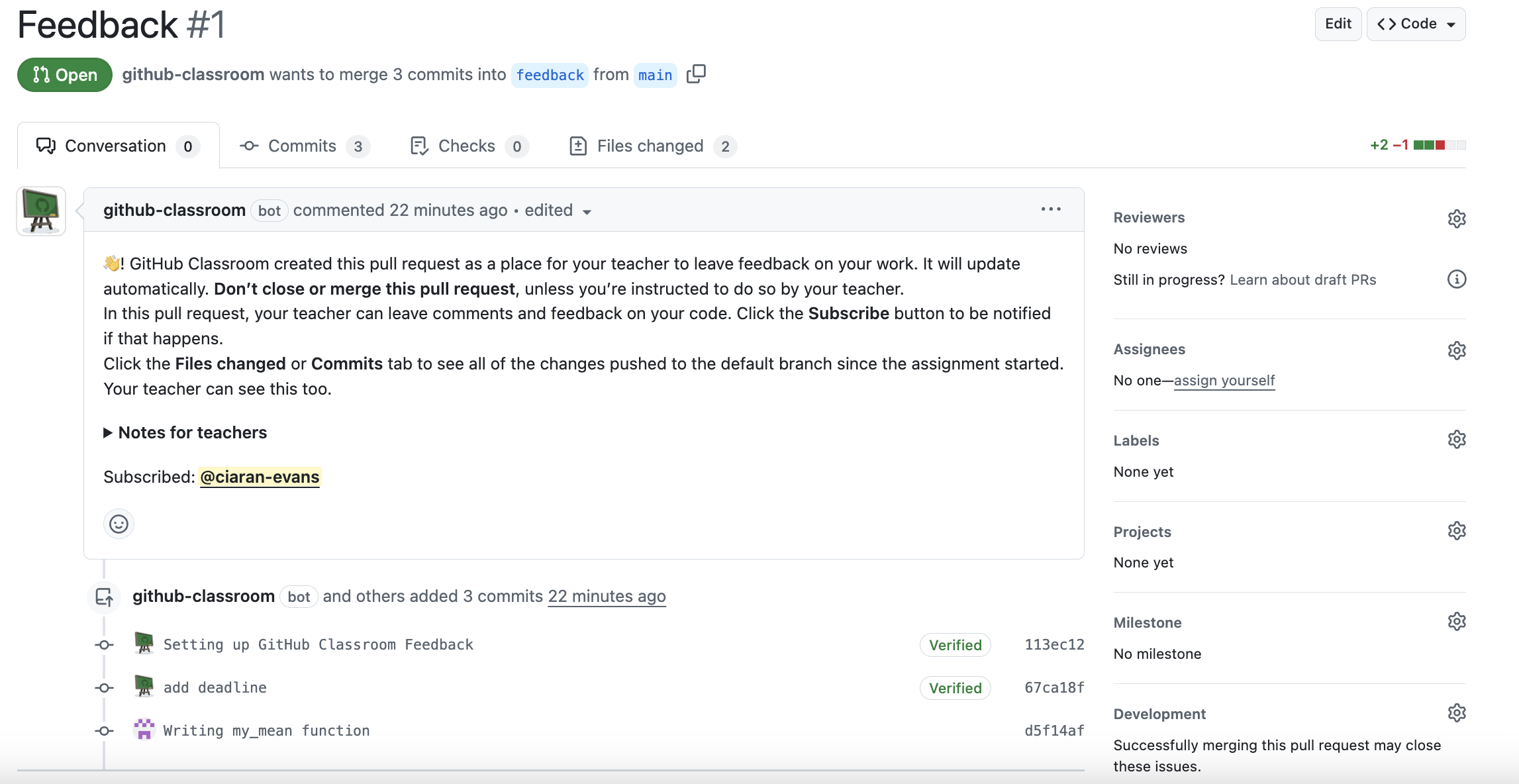 Once you have completed the assignment and pushed the final version of your work to GitHub, it is time to request feedback from the grader (me!). The way we will do this is with a Feedback pull request. Now, a pull request is really for requesting that changes on one branch be merged into another branch in the repository, but for simplicity we will not work with branches in this course (though you are welcome to try them out if you like!). Nevertheless, GitHub Classroom allows me to make an automatic pull request called “Feedback” which is created when the assignment repository is created. You can think of this pull request as a way for me to make comments on your code, for you to reply to my comments, and for us both to see the history of comments, requested changes, and commits.