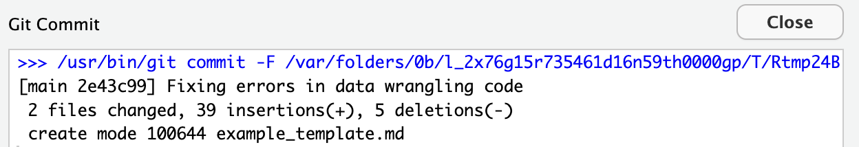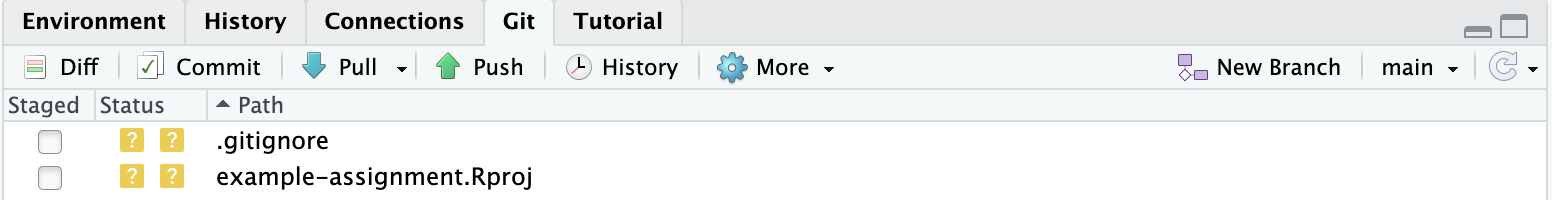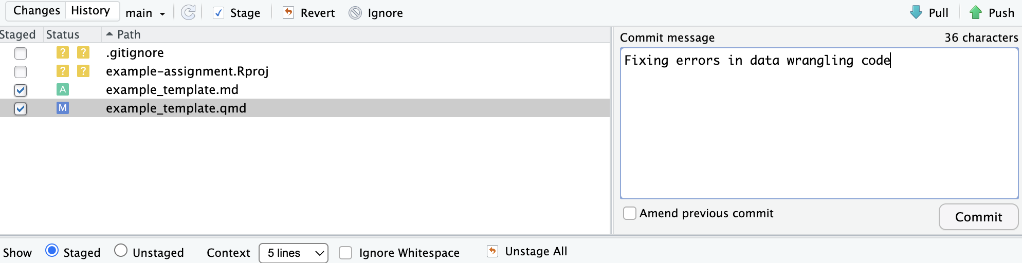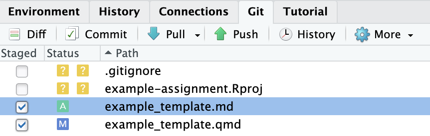 To make a commit, go to the Git panel in RStudio, where you will see any files which have changed since the last commit. You can ignore files like the .gitignore and the .Rproj files. Select the box next to the files for your work (.R, .qmd, .md, etc) to stage them for a commit (if you have used Git previously, this is just doing a git add). In the example assignment, you should stage the example_template.qmd and example_template.md files.