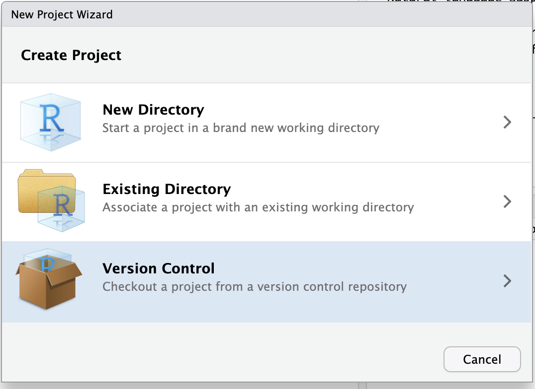 Now open RStudio, and click File -> New Project. This will open the new project wizard. Select Version Control
